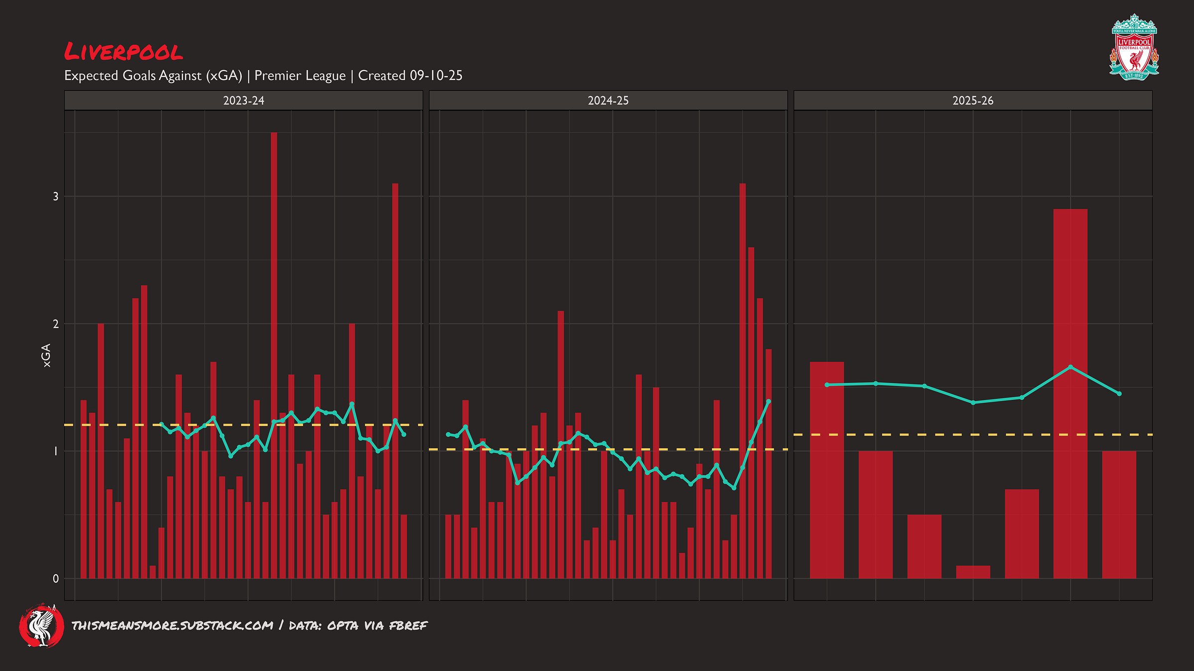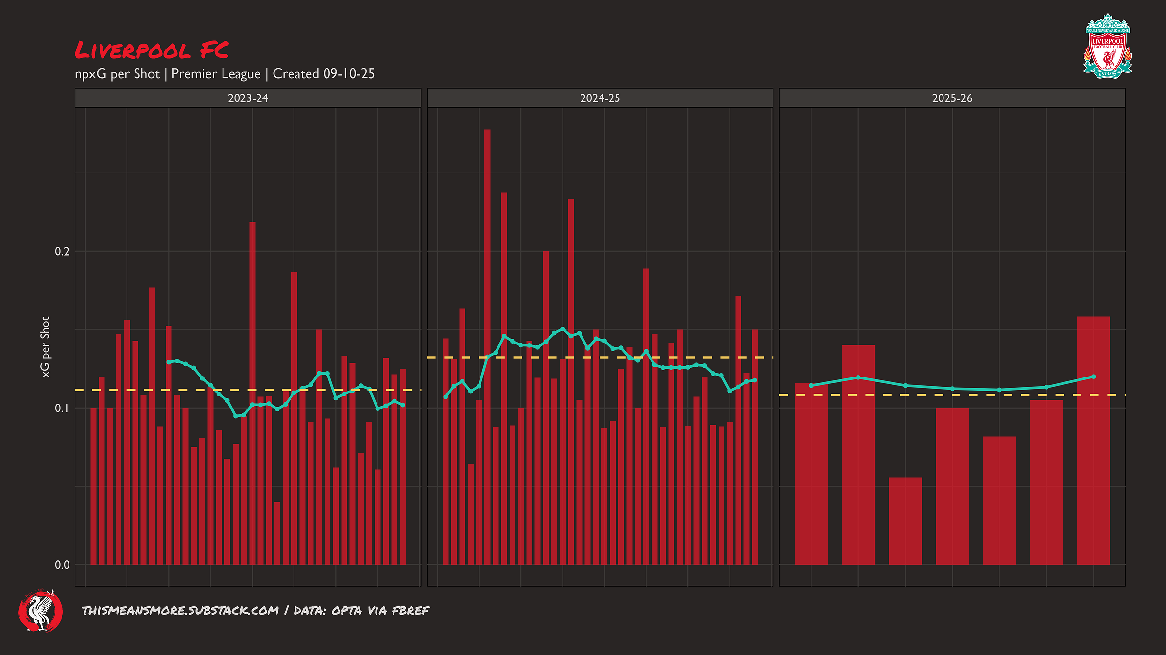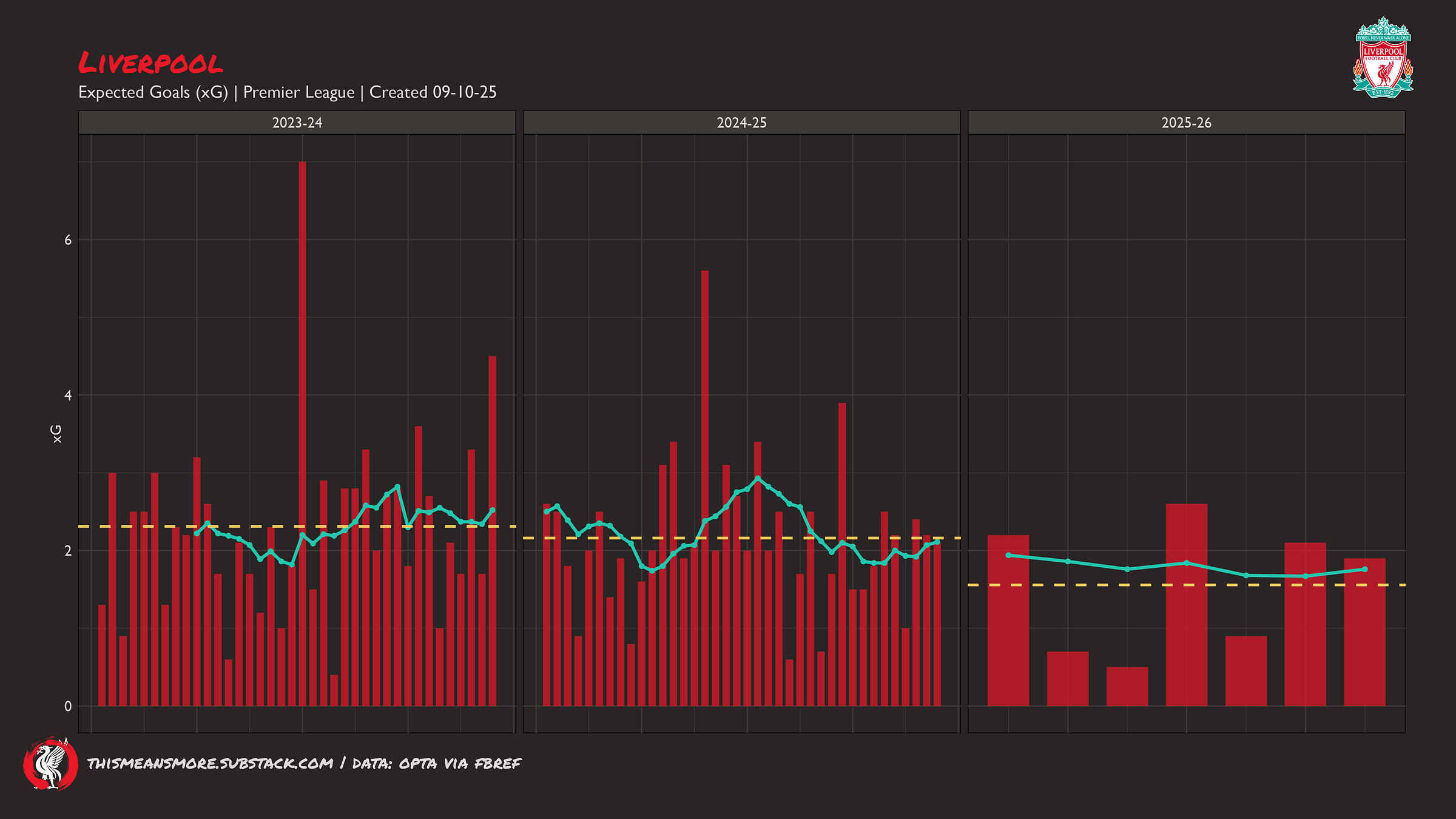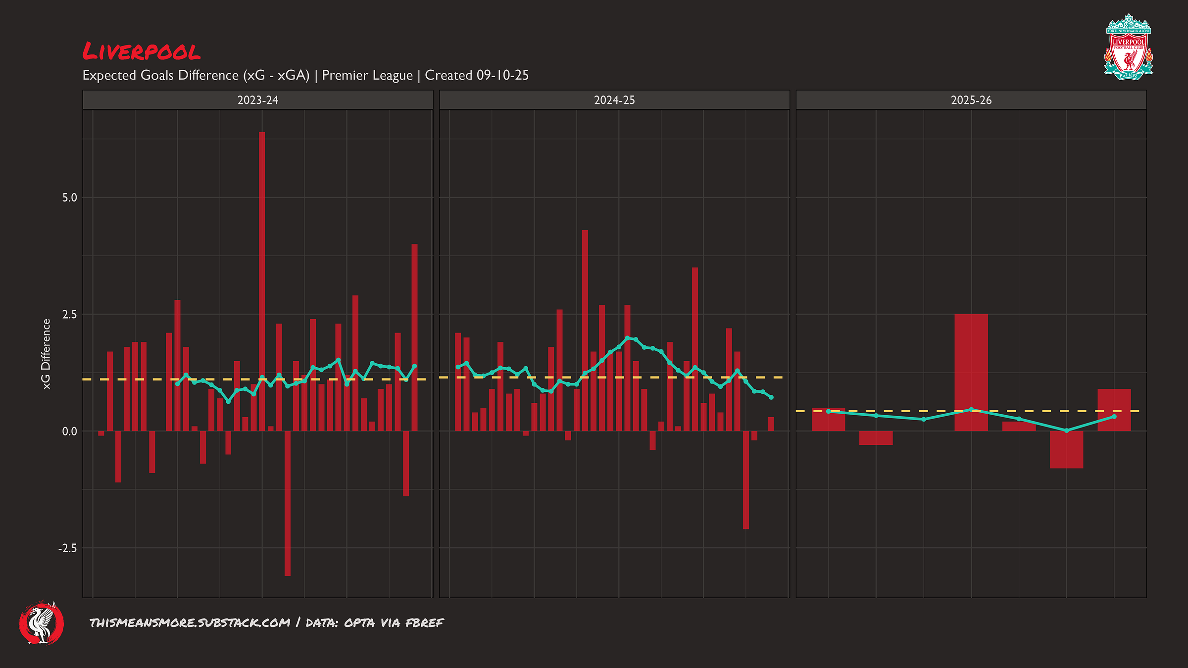 This is more concerning. I think most models consider a team to have ‘won’ a match on xG with a difference of +0.4, so Liverpool are just hanging on here. We would hope for Liverpool to be averaging way above this. Basically, every match Liverpool have been in has been close — they have ridden the tiger mostly, but are in danger of falling off if they do not become a dominant team again.