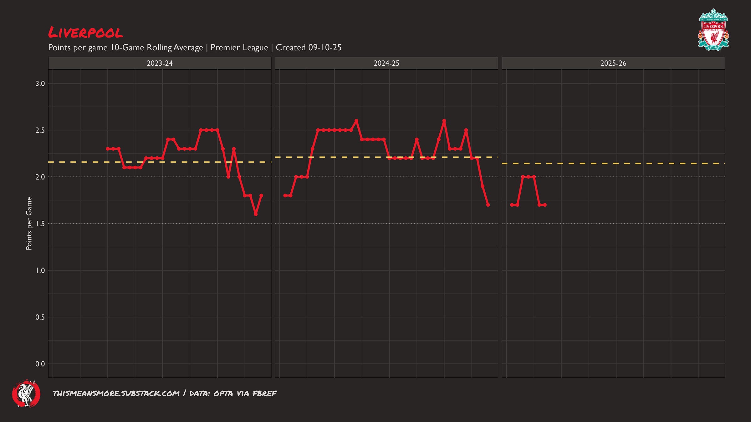 Here are Liverpool’s Points Per Game season averages (yellow) and continuous 10-Match Rolling Mean (red):