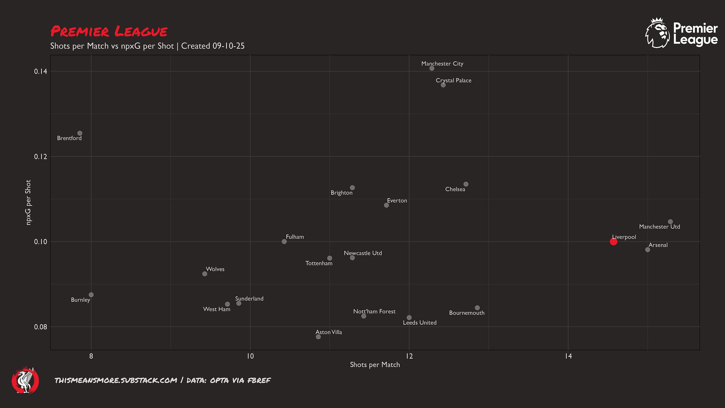 How is Liverpool’s shot quantity and quality compared to the league?
